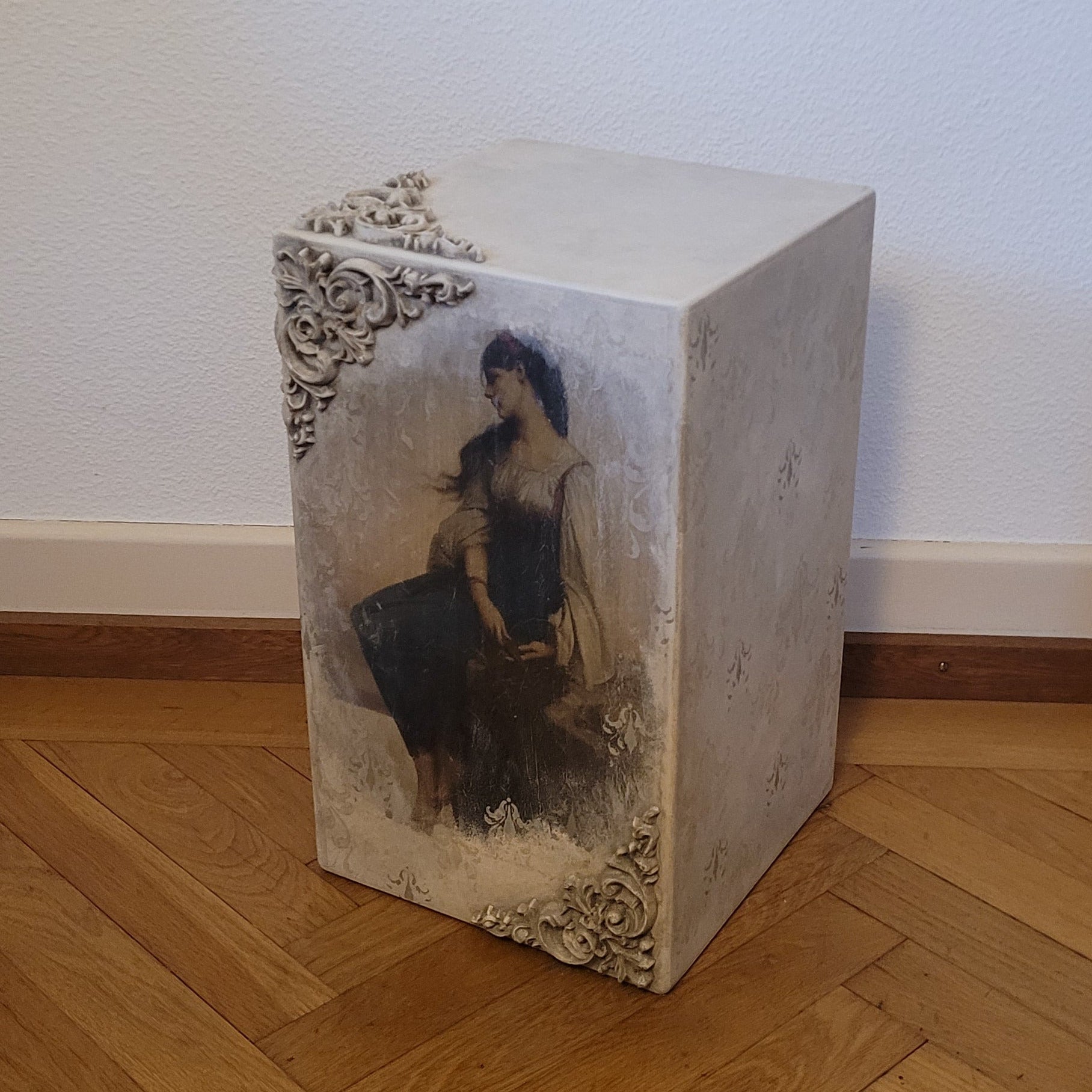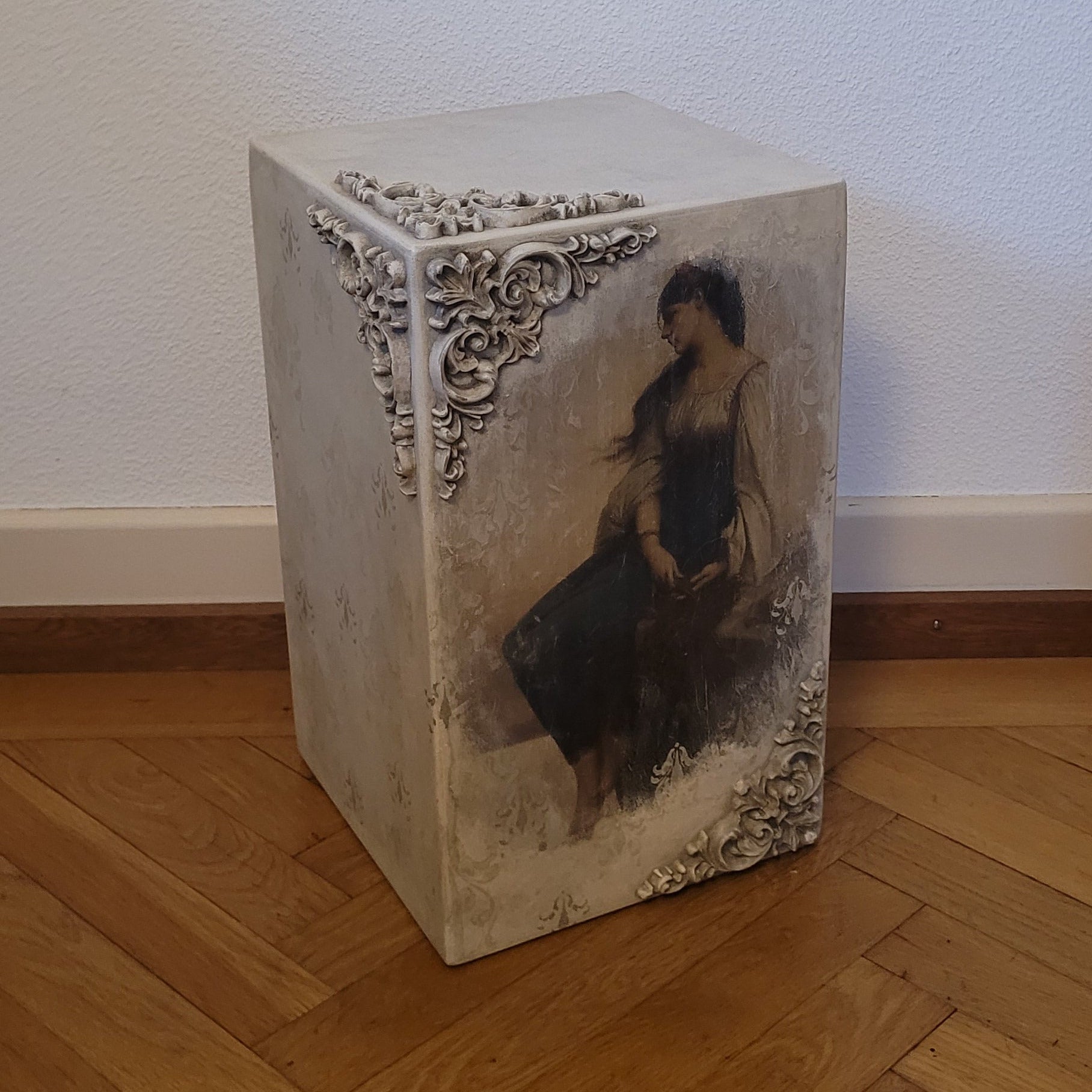Dieser charmante Blumenständer verbindet Funktionalität mit künstlerischem Flair. Das zarte Reispapierbild im Zentrum wird von eleganten Ornamenten in den Ecken gerahmt – ein subtiles Design, das jedem Raum Charakter verleiht. Perfekt, um deine Lieblingspflanzen oder Schnittblumen stilvoll in Szene zu setzen. Ein Hauch von Eleganz für dein Zuhause!