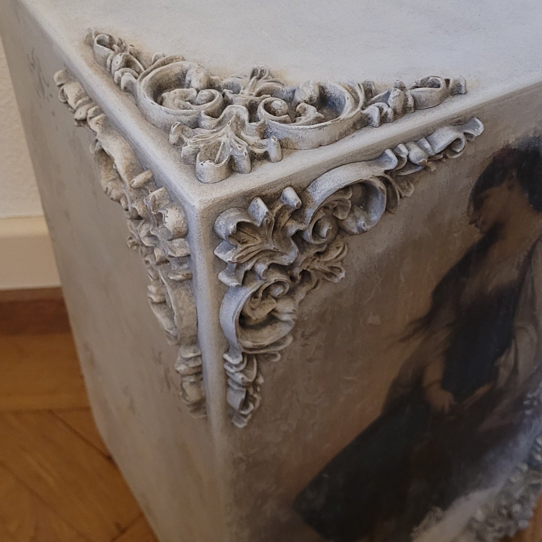 "HEMNES" Schminktisch aufgemöbelt mit Ornamenten von WoodUbend und gestrichen mit der Farbe Mouse Eggshell. Das Muster ist in weiss gewalzt mit einer Strukturwalze.