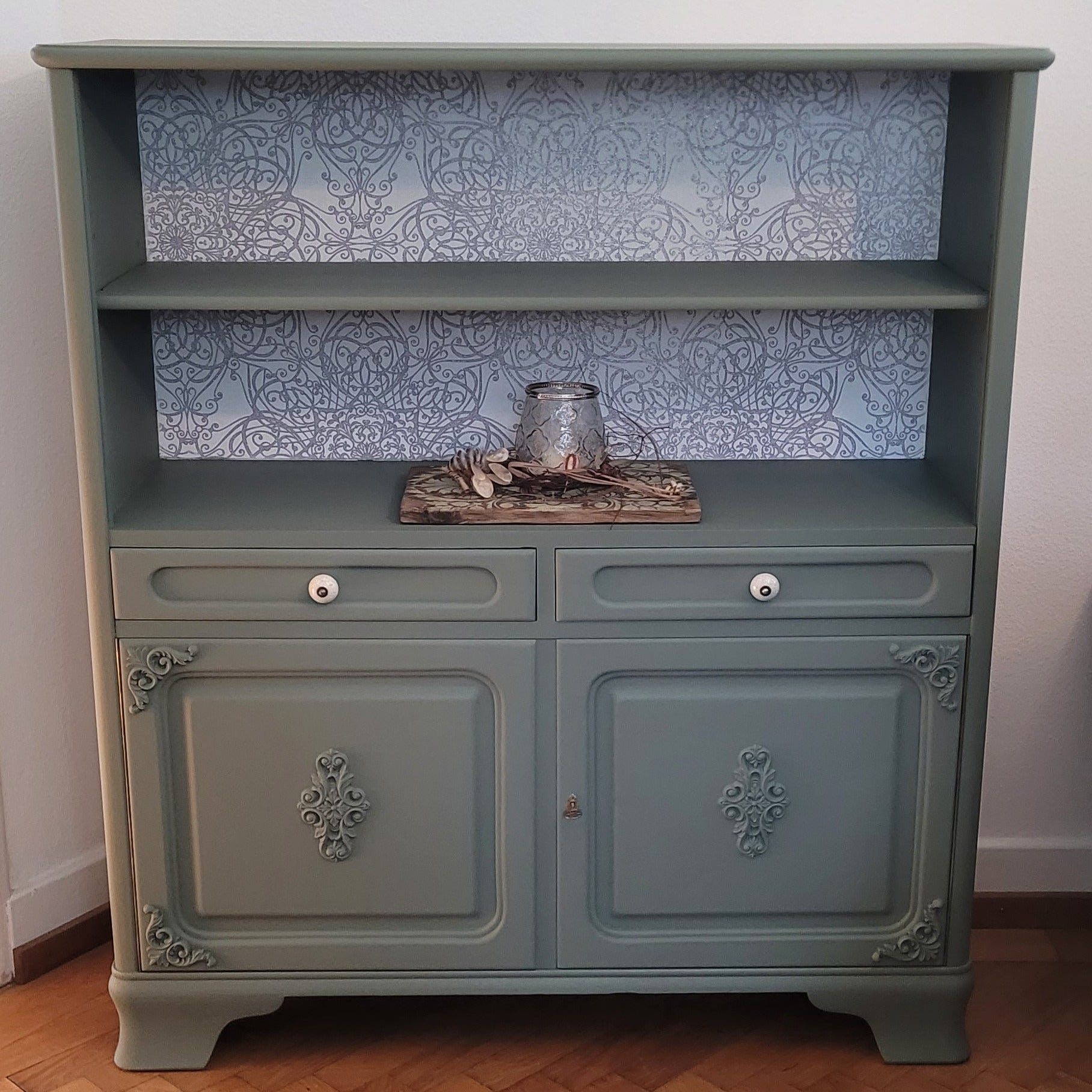 Das Buffet "Emilia" vereint klassische Eleganz mit praktischer Funktionalität. Mit seiner großzügigen Ablage bietet es idealen Stauraum für Geschirr, Gläser und Dekorationsgegenstände. Die hochwertige Tapetierung der Rückwand schafft eine raffinierte Kulisse und verleiht dem Möbelstück eine edle Ausstrahlung. Perfekt für Speisezimmer und Wohnbereiche, die sowohl Stil als auch Ordnung erfordern. Ein zeitloses Stück, das Ihre Einrichtung aufwertet.