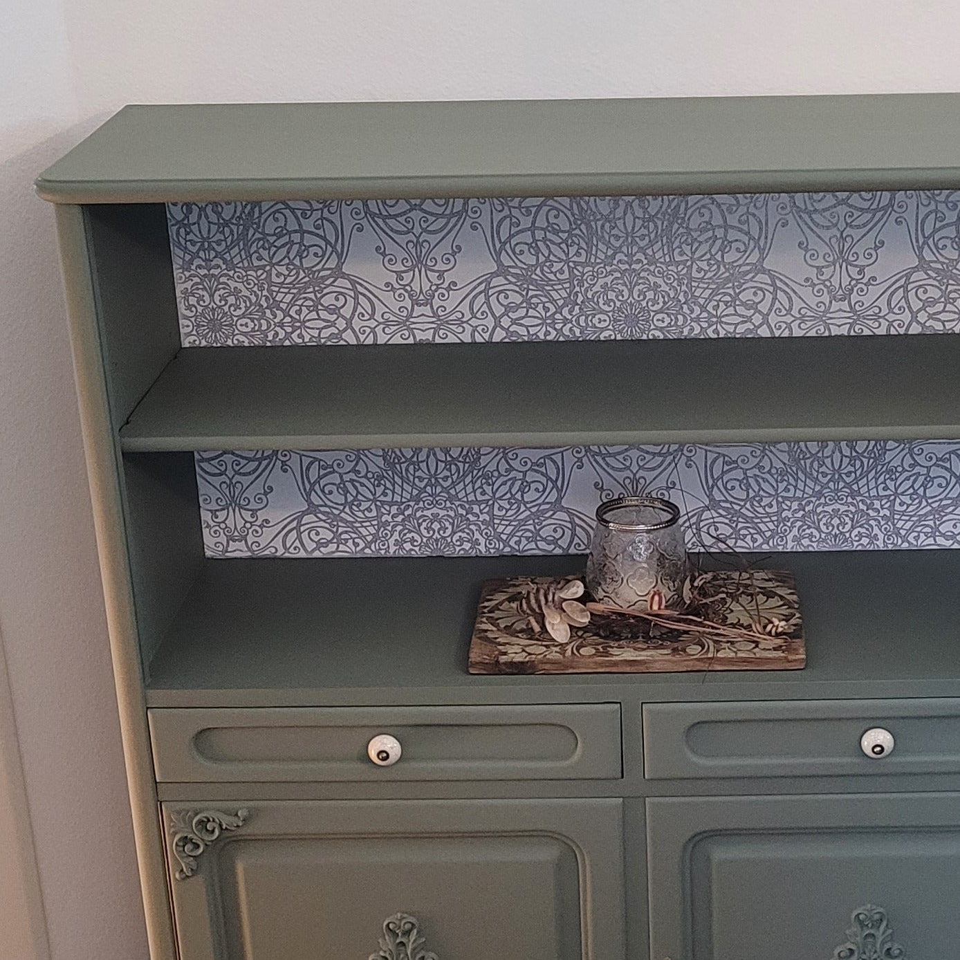 "HEMNES" Schminktisch aufgemöbelt mit Ornamenten von WoodUbend und gestrichen mit der Farbe Mouse Eggshell. Das Muster ist in weiss gewalzt mit einer Strukturwalze.