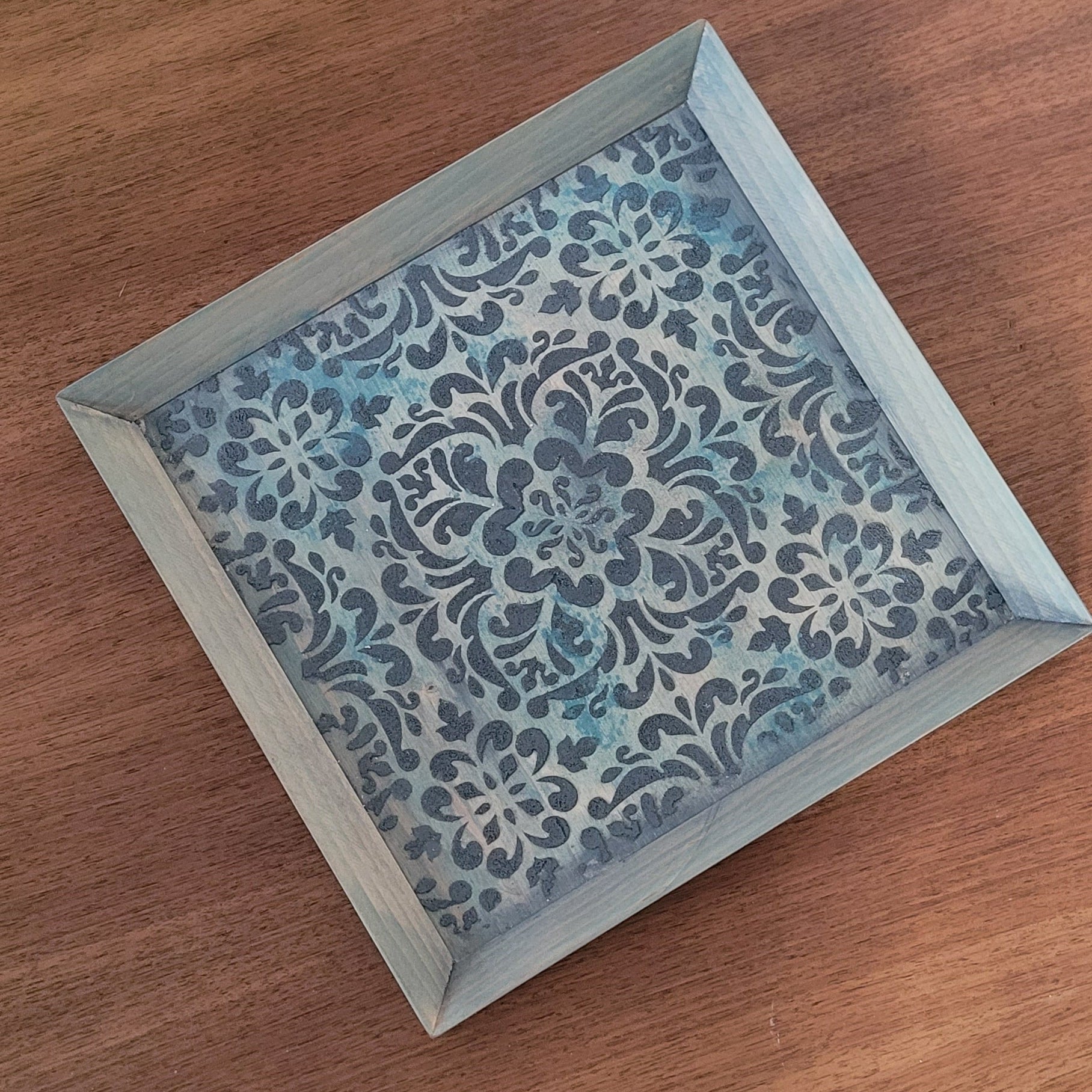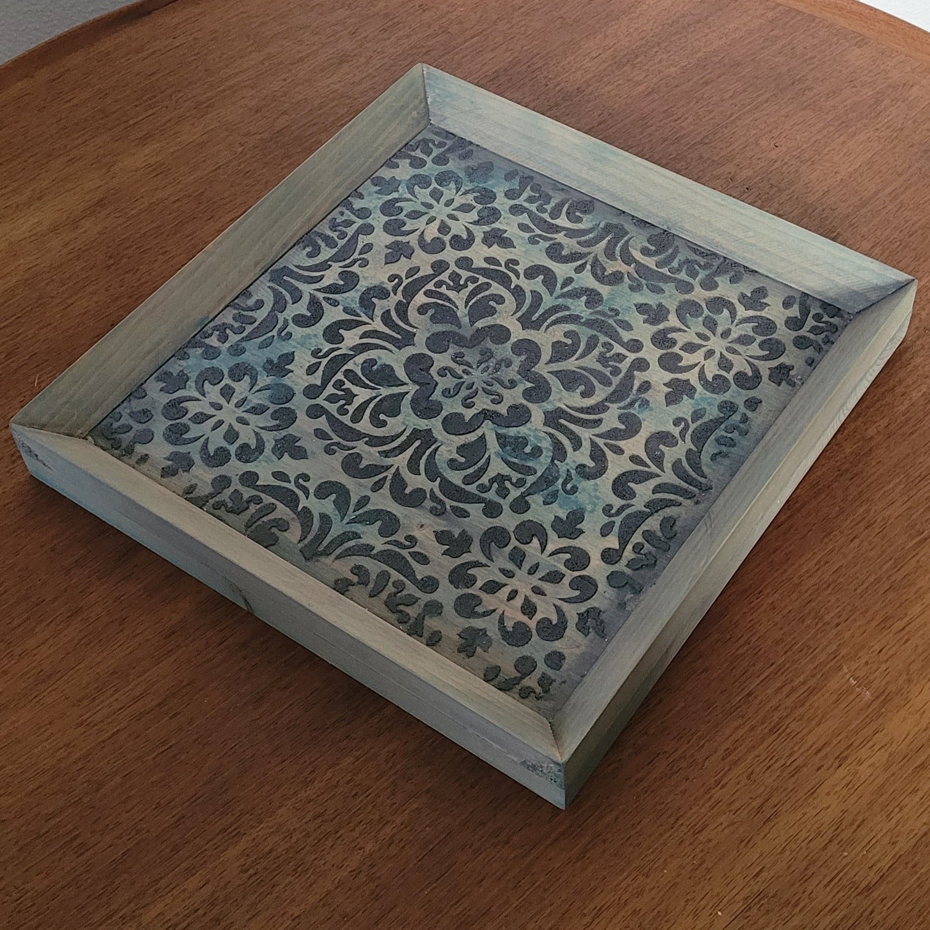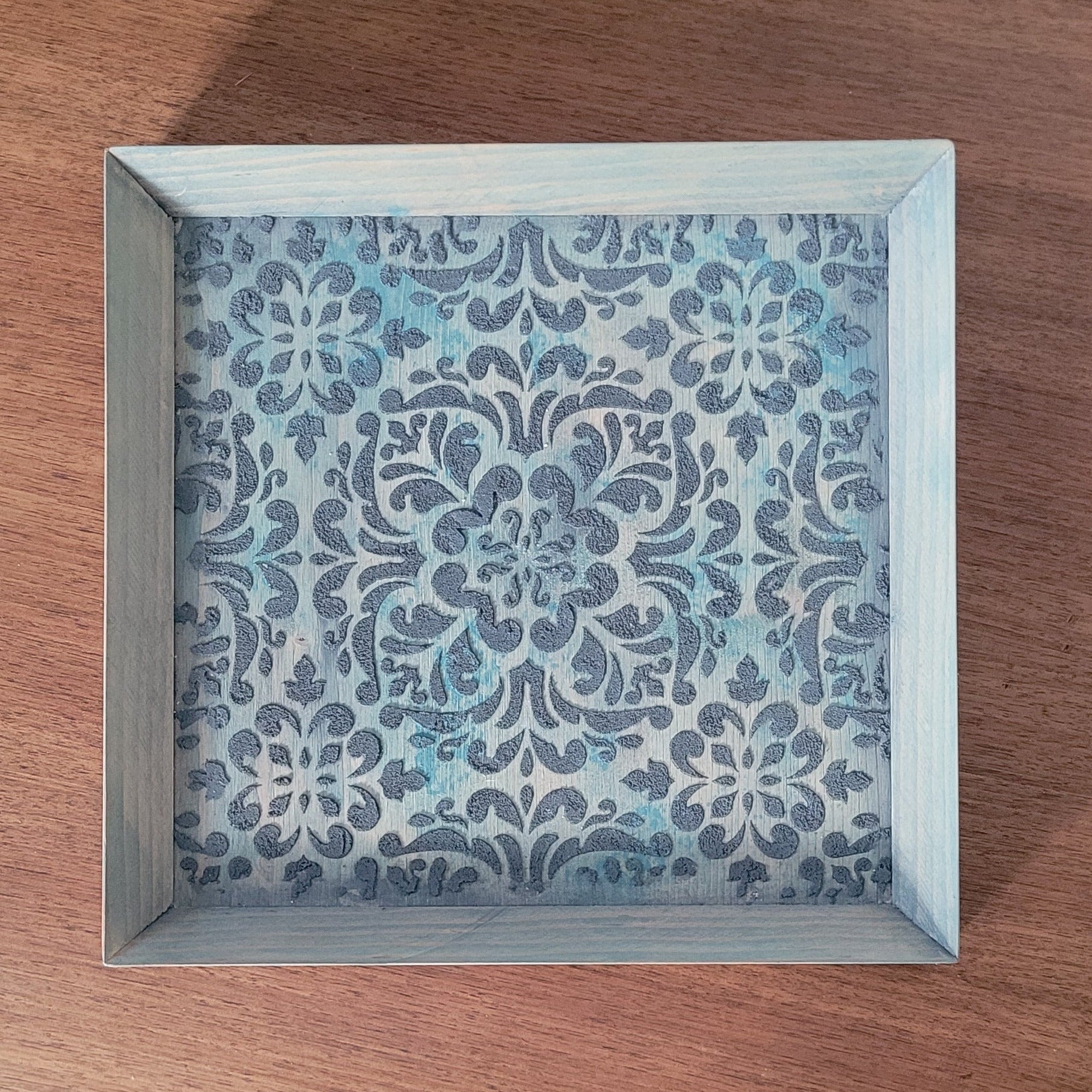 Schaffe eine gemütliche Ecke mit diesem charmanten Dekobrett in zartem Grün-Blau. Das strukturierte Muster verleiht Kerzen, Gläsern und Gestecken eine stilvolle Bühne und wird zum Blickfang auf jedem Regal oder Tisch. Perfekt, um deine Lieblingsstücke in Szene zu setzen und deinem Zuhause eine persönliche Note zu geben.