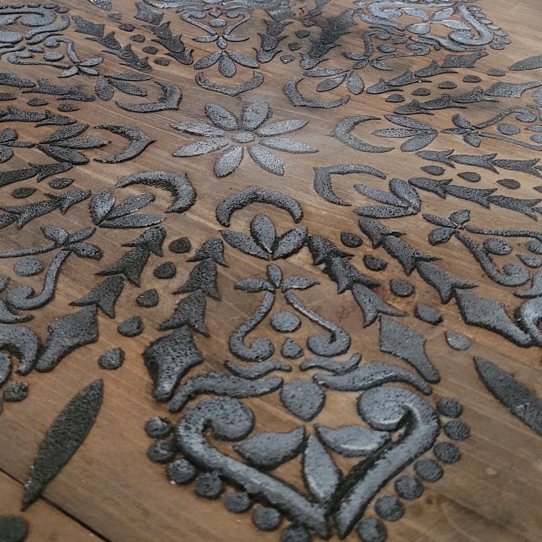 "HEMNES" Schminktisch aufgemöbelt mit Ornamenten von WoodUbend und gestrichen mit der Farbe Mouse Eggshell. Das Muster ist in weiss gewalzt mit einer Strukturwalze.
