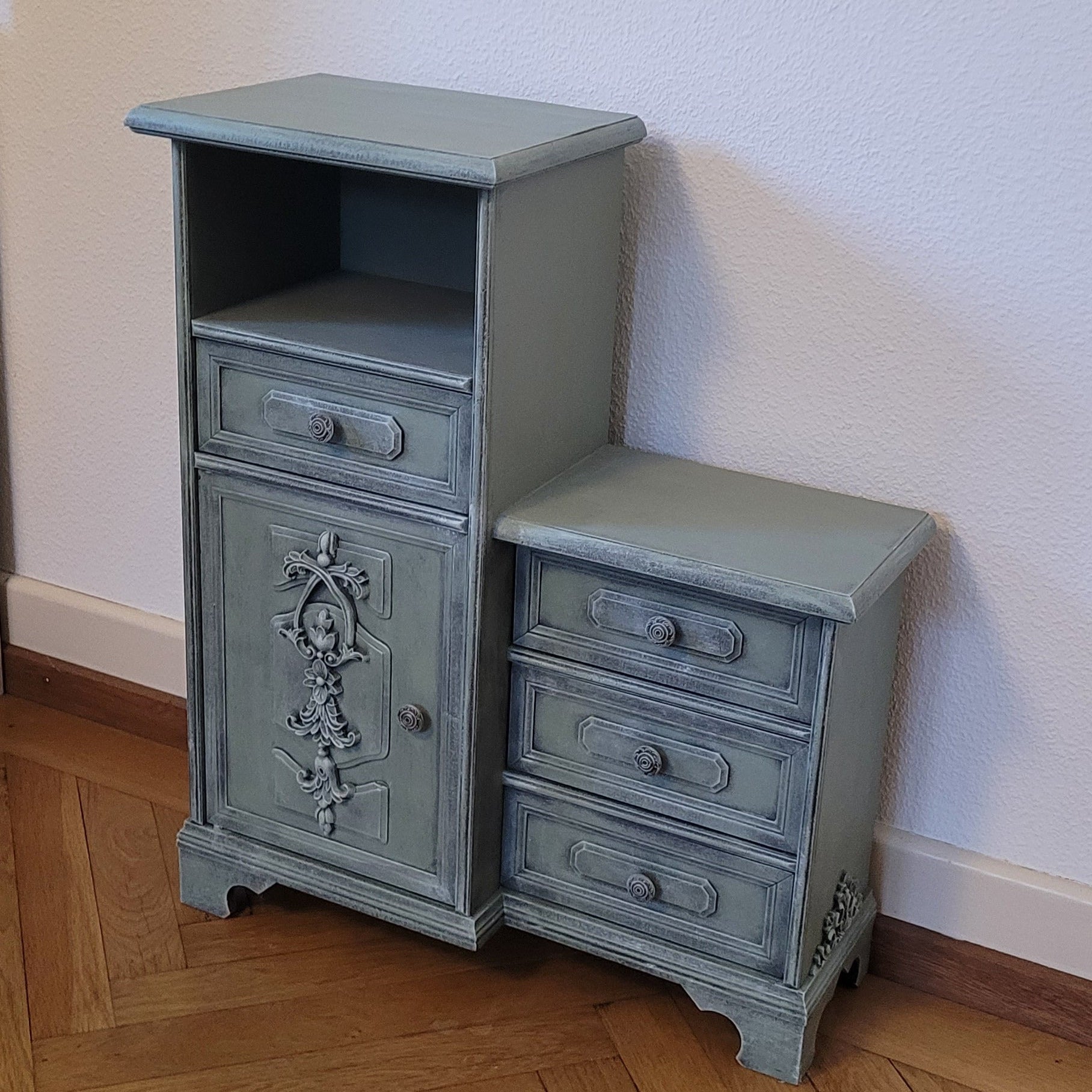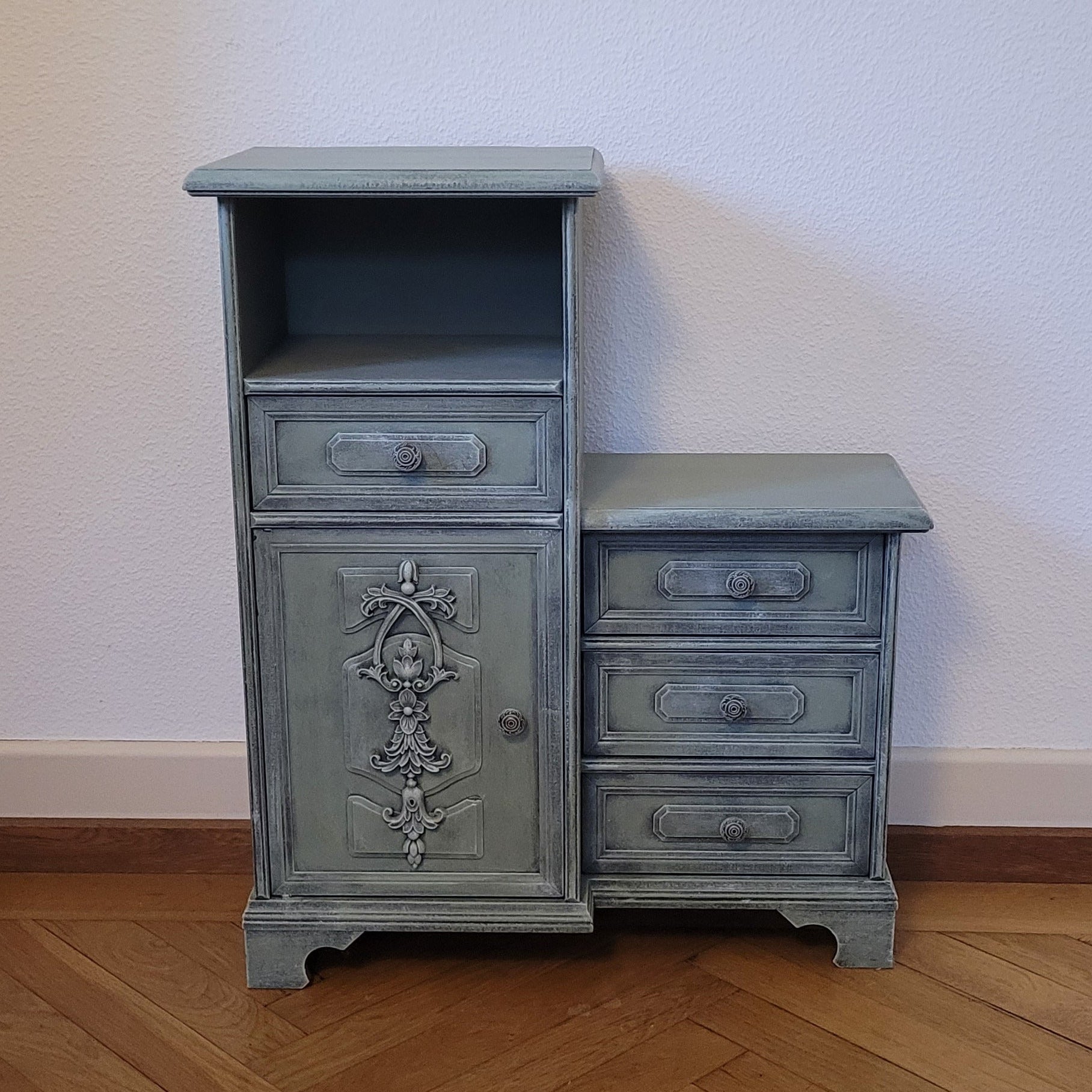 Dielenmöbel "Fynn" – dein neuer Liebling im Flur! Dieses charmante zweiteilige Möbelstück besticht durch seine elegante grüne Färbung und die kunstvoll aufgebrachten Ornamente, die ihm einen verspielten Charakter verleihen. Perfekt für alle, die ihrem Eingangsbereich Persönlichkeit und Stil schenken möchten. Kompakt, funktional und wunderbar dekorativ – "Fynn" macht jeden Flur zur Galerie!