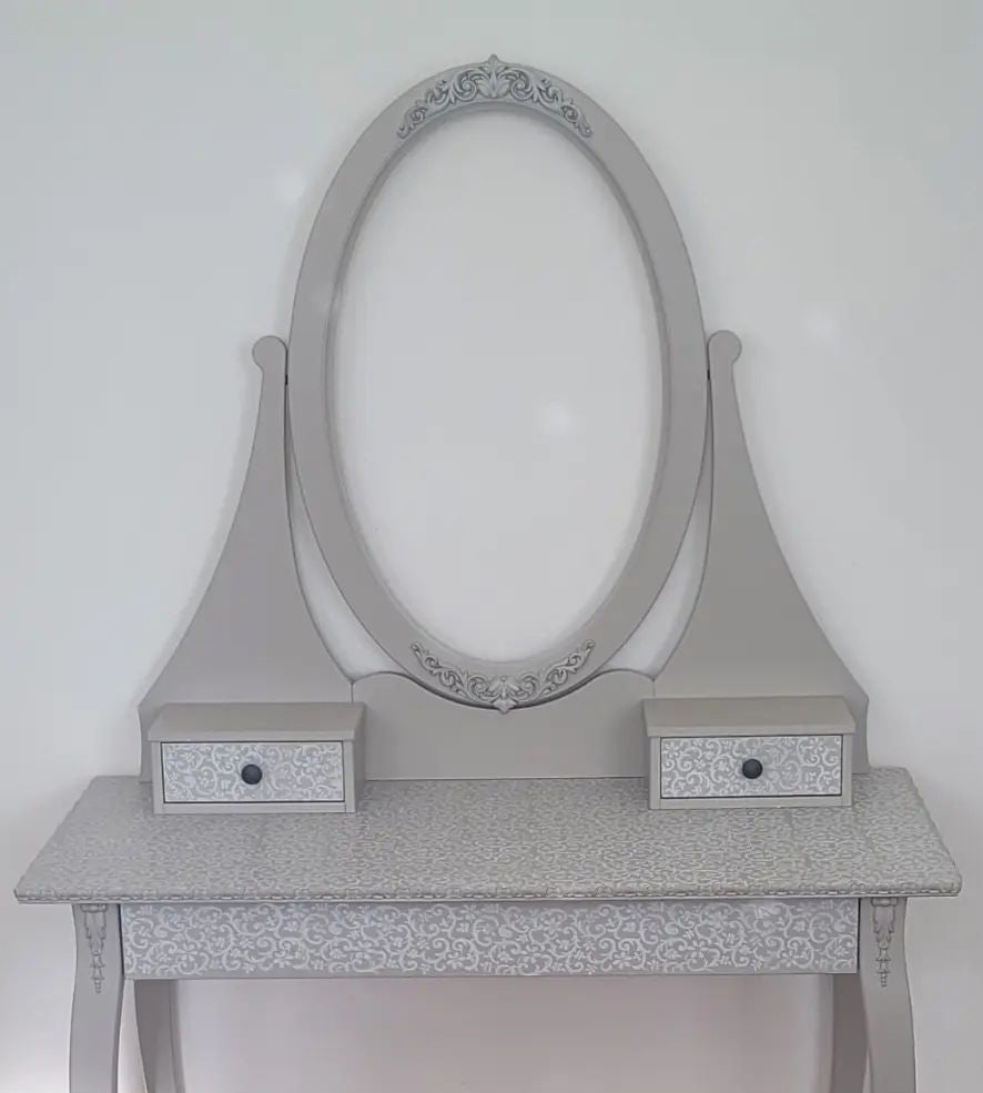 "HEMNES" Schminktisch aufgemöbelt mit Ornamenten von WoodUbend und gestrichen mit der Farbe Mouse Eggshell. Das Muster ist in weiss gewalzt mit einer Strukturwalze.