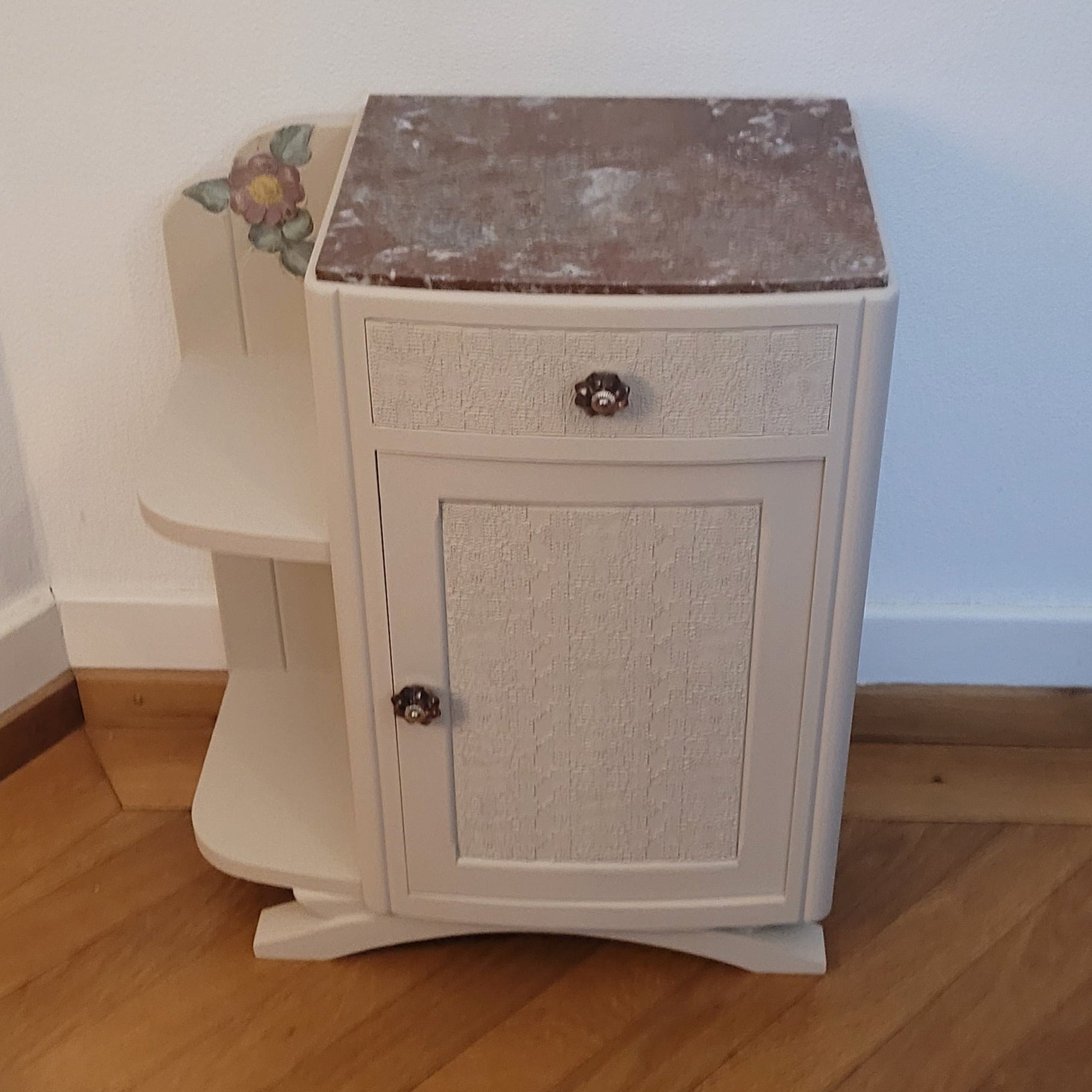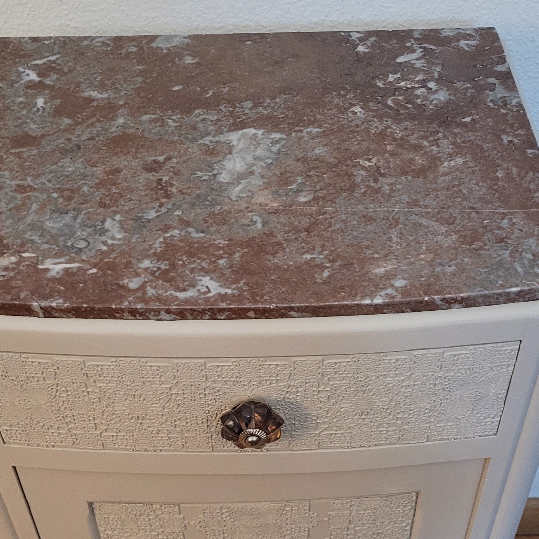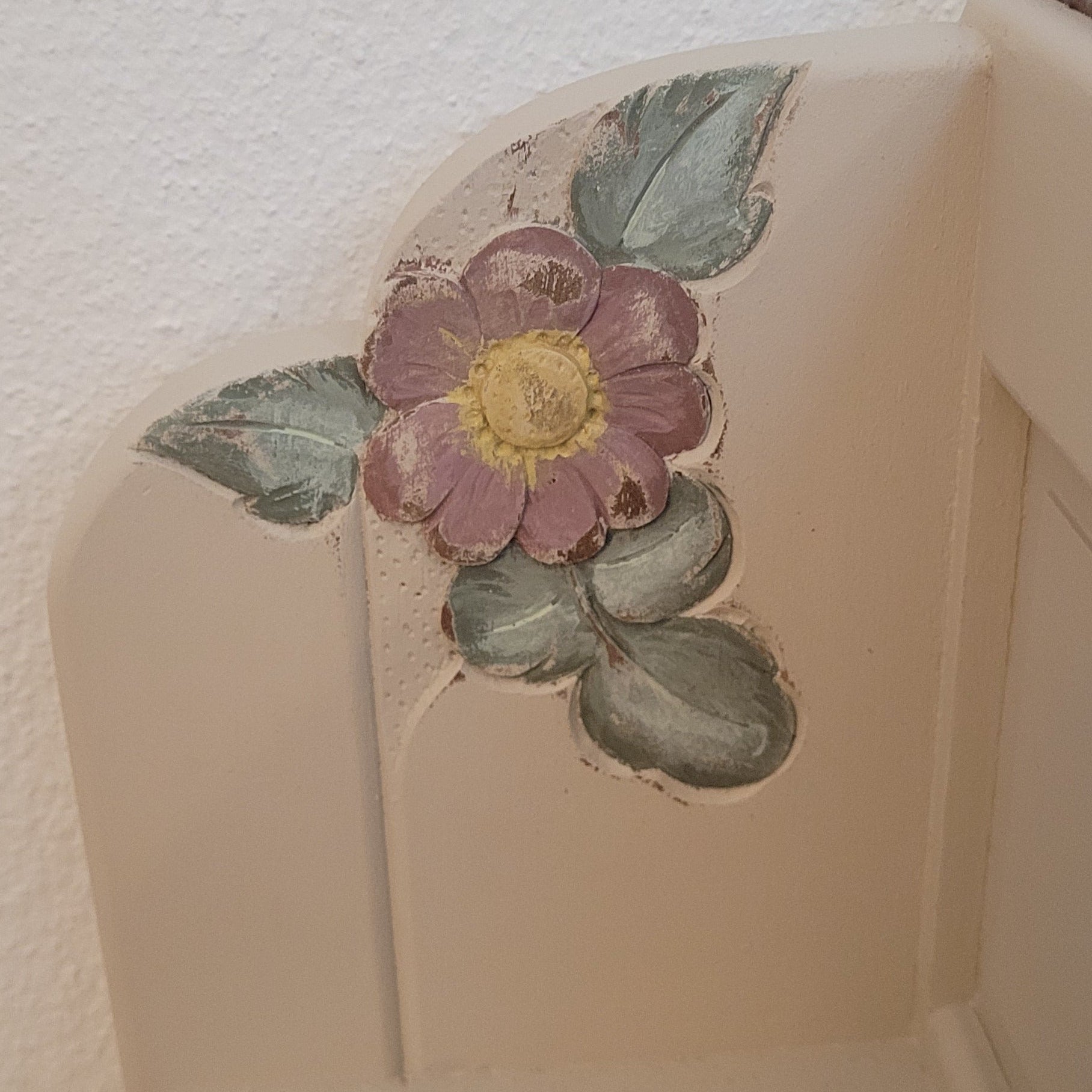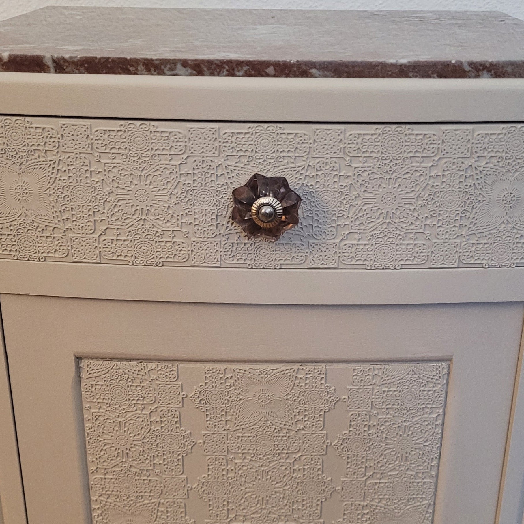 Nachttisch "Hannah" – dein charmanter Begleiter für süße Träume. Dieses liebevoll gestaltete Möbelstück besticht durch sein zierliches Design und das wunderbar verspielten floralen Muster auf Tür und Schublade. Die strukturierte Oberfläche auf Schublade und Türe verleiht dem Nachttisch eine besondere Tiefenwirkung und macht ihn zum echten Hingucker neben deinem Bett. Perfekt für alle, die ihrem Schlafzimmer einen Hauch von Natur und Eleganz schenken möchten – praktisch und wunderschön zugleich.